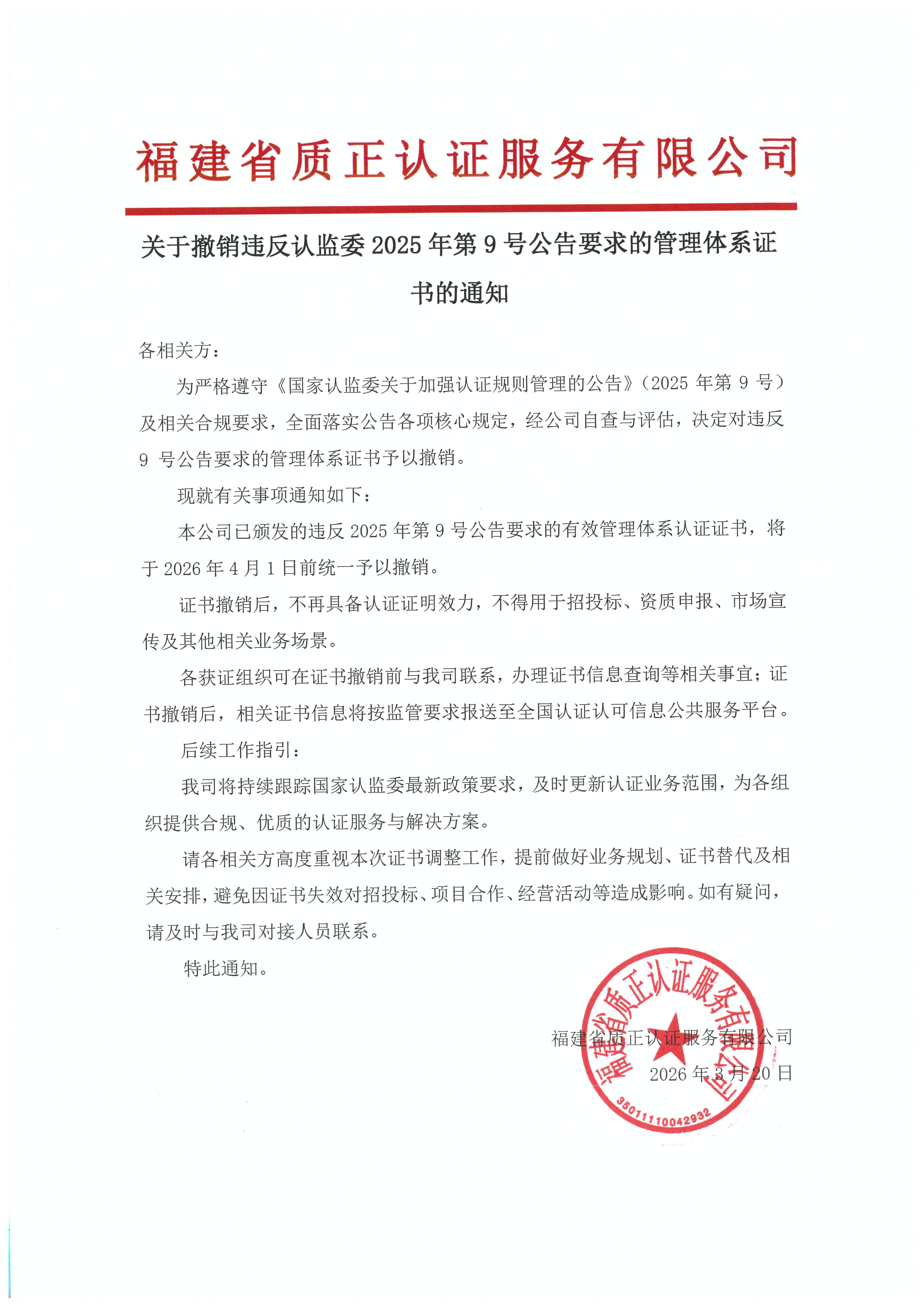 关于撤销违反认监委2025年第9号公告要求的管理体系证书的通知